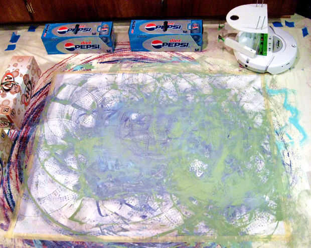 La forma muy más fácil pintar con sensores es el programa de ejecución la muestra 'cubierta' con los objetos alrededor del perímetro de la zona de pintura y hasta algunos objetos pesados (que son resistentes a la pintura o envuelto en papel encerado) dentro del área de pintura. Pero probablemente desea un poco más control que el, y he añadido el módulo de comando a la lista de materiales por una razón.