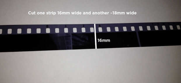 Cortar una tira de la película al ser de 16mm de ancho. Esto es el ancho de película de 110. Me llamará a esto la "tira" y usará esto para asegurarse de que nuestra configuración es correcta antes de que realmente usamos el carrete y para cargar el carrete antes de que realmente usarlo. Sería agradable si esta pieza fue un pie o así (~ 30cm), pero sólo asegúrese de que esté lo suficientemente largos para simular carga alguna película. Sugiero esto versus uso real 110 negativos porque si utilizas 110 reales negativos podría conseguir rasguñados. Además, no puede tener cualquier 110 negativos en este punto, esta clase de razón que hacemos esta cosa danged en primer lugar ;-)