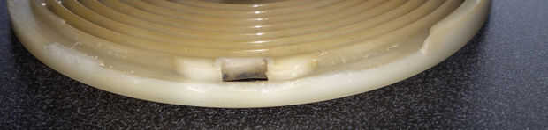 Alrededor del mecanismo de rodamiento de bolas hay un poco de un zig-zag en la ruta de los negativos, para que el rodamiento de bolitas puede aumentar contra los negativos. Como no estamos usando este método para cargar los negativos, regreso recortado el primer bit de la espiral para que se deslicen los negativos earier.