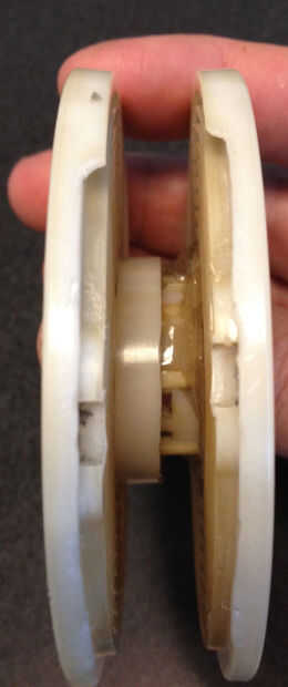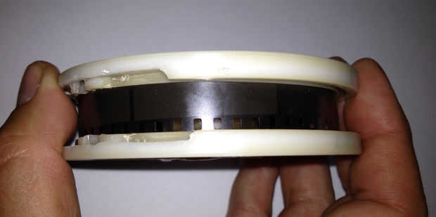 Mezclar un poco de pegamento epoxi y frote un poco entre las dos mitades de la bobina. No utilice mucho ya que queremos poner a prueba con la tira de 16mm (que tiene el mismo ancho 110 real película), para asegurarse de que se desliza fácilmente hacia adentro y hacia afuera. Asegúrese de que las dos mitades de la bobina son paralelas entre sí.