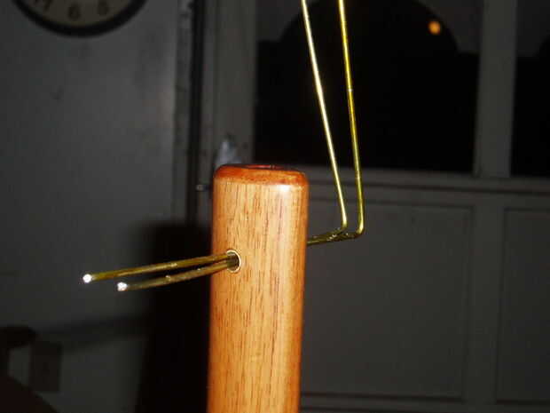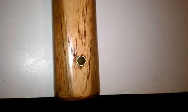 Yo también quería tener un agujero de cordón en el extremo de la manija. Fui a una tienda de hobby y consiguió algunos tubos de latón 1/4 de pulgada de diámetro exterior. Taladré un agujero de 1/4 de pulgada, cortar un trozo de tubo para encajar. He utilizado un archivo bien y luego a papel de lija para formar el bronce a nivelarse con el mango.