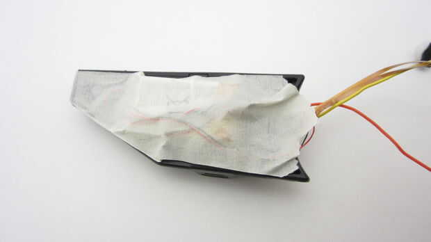 Os adjunto la batería al lado de la caja con cinta de doble palo. Luego até los cables sueltos a la cubierta con un trozo de cinta adhesiva.
