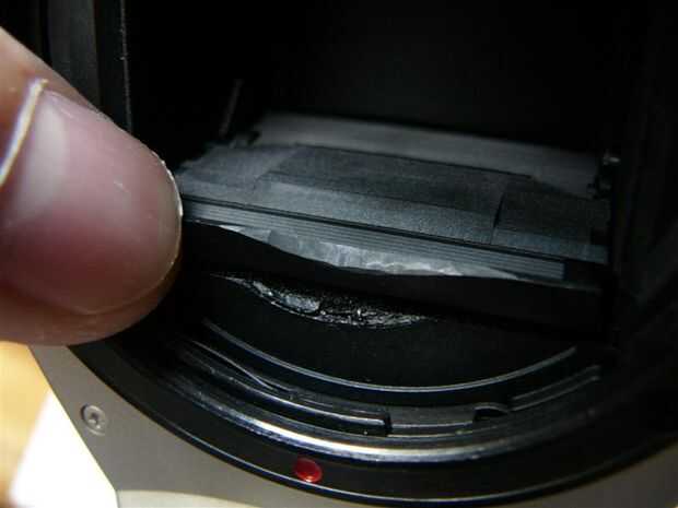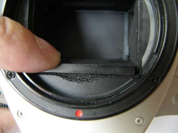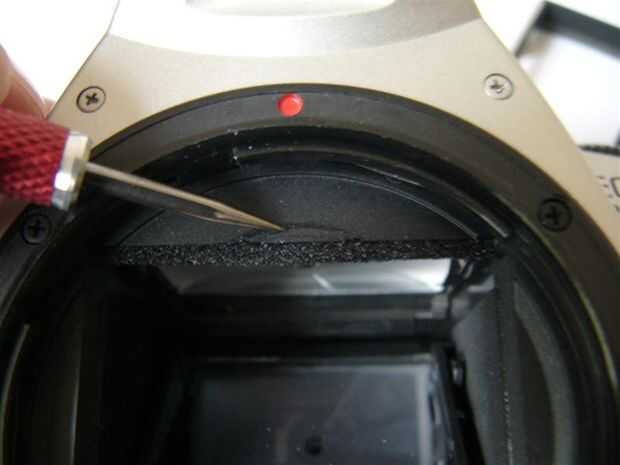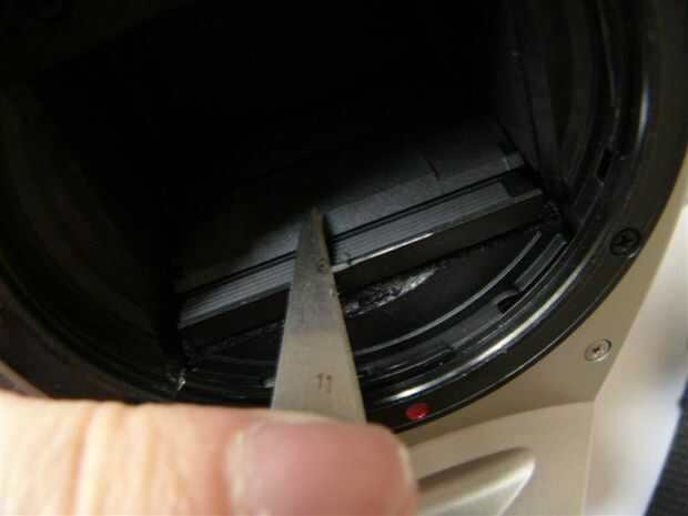 Hay dos problemas, el primero es cuando se atornille el M42 en su lugar, el diafragma perno golpea ligeramente un tablero en la parte superior. Hay un riesgo de romper el pin, que no es agradable. Por lo tanto, te afeitan pieza plástica en la ruta de. El perno en la discusión se muestra en la primera foto, los pasos se muestran en las siguientes tres fotos. Si no desea modificar (daño) la cámara como esta, siempre puede poner la lente en el modo Manual de diafragma y enroscar la lente con el frente hacia abajo.