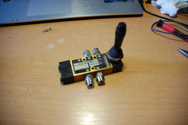 Entonces tuvo la idea de utilizar una válvula de control de la mano y operar mecánicamente utilizando un servo "RC". La válvula neumática que tenía es una posición/5 3 puertos (2 de los cuales son independientes de los puertos de escape) válvula de control con un resorte en la posición central. El problema era que este resorte de retorno era bastante rígido y la fuerza necesaria para mover la válvula era demasiado alta para un servo RC regular. Entonces decidí modificar la válvula.