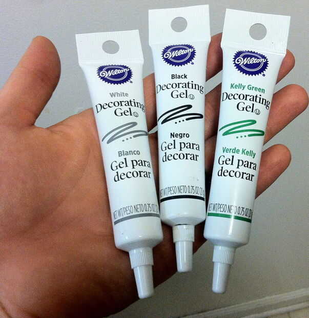 A continuación, llegó el momento de utilizar tubos de Gel de decoración de Wilton para los detalles. Nota: he considerado comprar caramelo hecho de antemano "ojos" pero no tienen el tamaño correcto en la acción, además tienden a ser desagradables comer, especialmente para los niños. La parte desafortunada sobre el uso de los tubos de gel es si tus cupcakes no son planas, es decir, que mucho la mezcla por taza, ojos y bigotes se ejecute y distorsionar.
