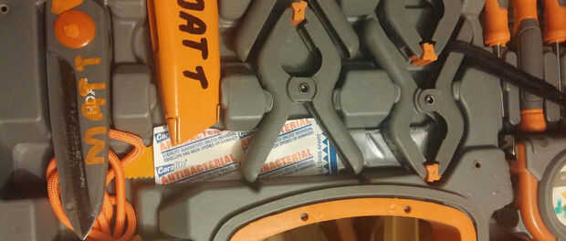 2. En primer lugar, es en el almacén grande bajo el martillo/Llave (junto con el carpintero lápiz, cinta adhesiva, pedacito de taladro y Destornillador extra).