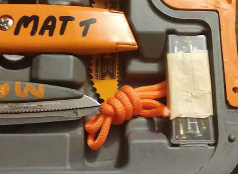 2. Añadir paracord atado al área de almacenamiento bajo las tijeras y caja plástica (ahora explotación tornillos sino que se utiliza para sostener cuchillas.