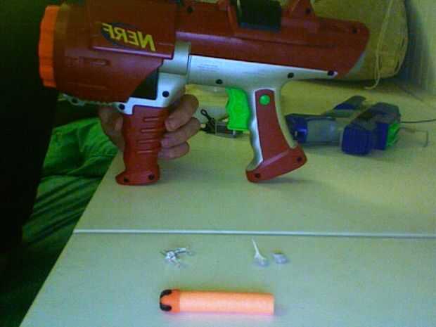 el Nerf dart dispara y actúa como una bala de escopeta.Conseguí esta idea de N-delantero * y Celloman * de (su) idea de escopeta de dardos de KVG.También tengo otra idea se me ocurrió con el de Stefans (de trenzado y otras personas) que se pueden uti