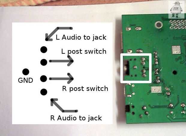 Zumbó-hacia fuera (probador de continuidad) donde los pines de audio izquierdos y derecho terminan en el PCB, con un cable jack repuesto conectado, asegurándose de tener el lado correcto de la "contactos en marcha" en la toma.