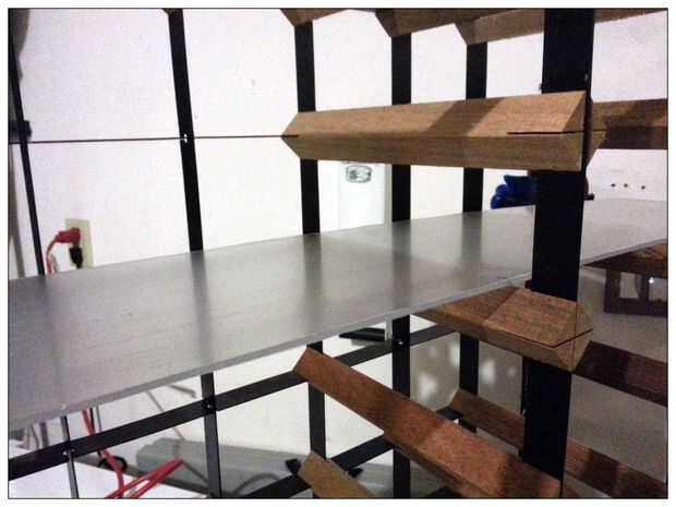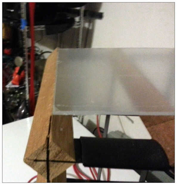 El siguiente paso es cortar la hoja del policarbonato para que coincida con las dimensiones de nuestro estante. Mida el ancho de la parte interior de la cremallera y la prueba de ajuste para el ancho antes de cortar para la longitud. Una vez que la anchura es correcta (sólo cabe sin atar para arriba) luego Mida y corte para la longitud. Tenga en cuenta que la longitud se mide desde la línea central de las clavijas del exterior. Por qué ello será evidente cuando los estantes se fijan al bastidor.