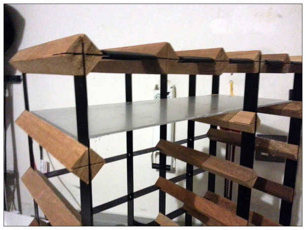 Una vez el los estantes son cortar y colocar (como en la foto), es el momento para perforar algunos agujeros para que podemos fijar nuestras estanterias al bastidor. Usando el bastidor como guía, nos marca un agujero en cada esquina y dos para cada clavija en el medio. Nota de la imagen que estos agujeros no tienen que ser perfectos, basta con que están cercanas y que el diámetro de la broca es ligeramente más grande que los lazos del cierre relámpago. En este caso el bit utilizado fue 3/16"