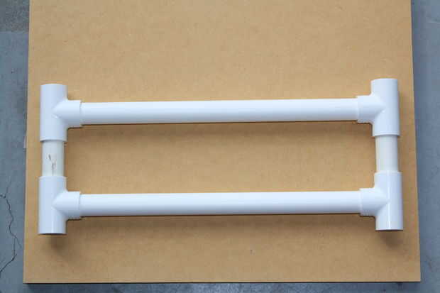 PVC cada marco está hecho de 4 de los conectores de salida de 3/4", 2 secciones más largas de la schedule 40 PVC de 3/4" y 2 secciones cortas de la PVC de pared delgada 3/4". La longitud de las secciones depende del tamaño de cañeros que está utilizando y hasta qué punto aparte son los orificios de montaje. En mi caso, usé 14-3/4" largo secciones transversales que deben ser espaciados aparte de 4-1/2". Se me olvida lo que la longitud del PVC de pared delgada se usa para obtener esa separación... variará dependiendo del marca/fabricante de los conectores que está utilizando. Una vez completado, la distancia entre los centros de los dos lados era 16"; Esto entrará en juego cuando construimos el stand.