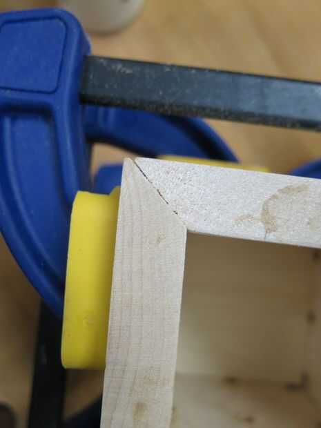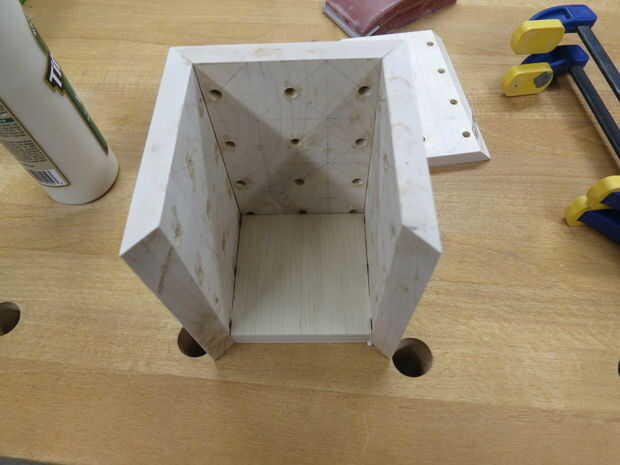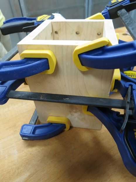Después, reuní la caja con pegamento de madera. Pegan los laterales y la parte inferior de una vez y las piezas con abrazaderas a cabo mientras el pegamento seca. Ser paciente cuando Alinee la caja y apriete juntos, su clase de complicado levantarse correctamente las uniones de inglete a la línea. Se puede ver en una de las fotos que mina no son perfecto. Sin embargo, esto era la primera vez que usé una Junta de inglete estaba feliz con los resultados.