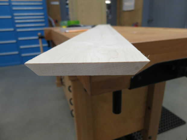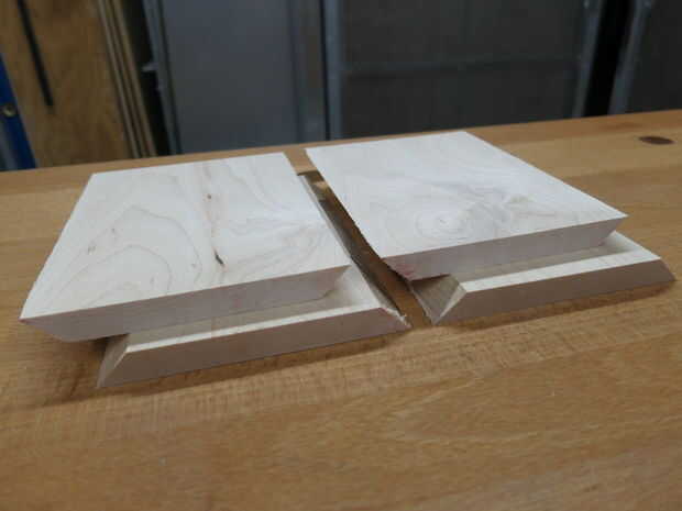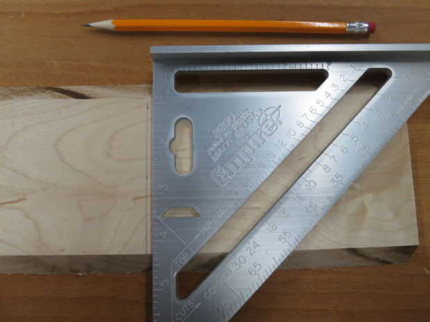 En primer lugar, había planeado la Junta arce 0.5" de grosor. La junta fue mucho más tiempo del que necesitaba, pero me pareció más fácil (y seguro) utilizar la Sierra de mesa y chop vio con piezas largas de madera que realmente corto. Luego, corté un trozo a dejar de lado la parte inferior, por lo menos 4" de largo, preferentemente ya para facilitar el corte. Entonces, usando la tabla vio en un ángulo de 45°, corte la tabla en cada lado por lo que fue la dimensión final de 4.5" en su punto más ancho (3.5" en su parte más estrecha). Ver foto para descripción. Usando la chuleta de sierra, cortar la Junta (4) 6" piezas de largo. Ahora, con ese pedazo de dejar de lado anteriores, con la tabla de sierra a 90°, corte la tabla para ser 3.5" de ancho. Usando el chop vio otra vez, corté un 3.5" pieza fuera del tablero, dejándome con un cuadrado de 3,5" X 3,5" que era 0.5" de grosor.
