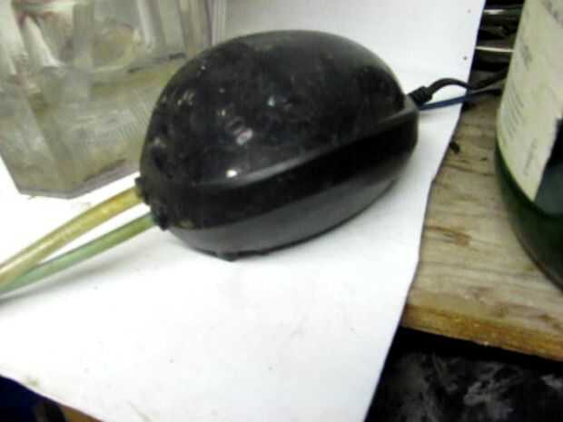 Utiliza una bomba de 2 salida acuario burbuja.  Es capaz del 3 psi (lo suficiente como para empujar aire unos 7 pies de profundidad en agua y aproximadamente 2 litros por minuto de aire.