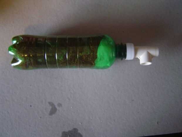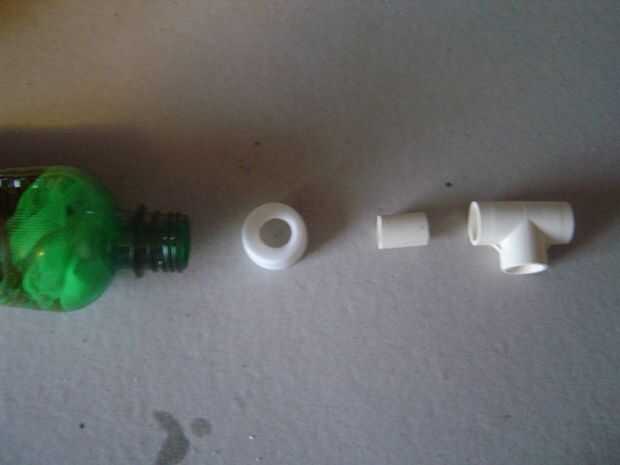 5. colocar el TEE en un extremo de la pieza de 1 pulgada de la tubería de CPVC y la botella del burbujeador por otra como se muestra.