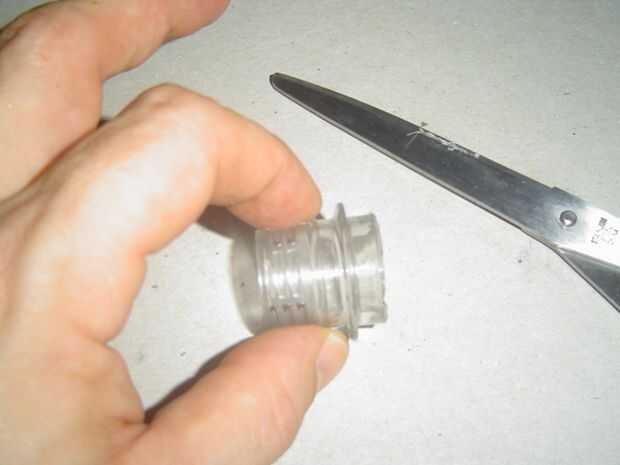 5. usando scizzors, cortan el cuello de la botella pequeña e Inserte el orificio de 1 pulgada como se muestra. Utilizar una botella pequeña como que no son "quemados" como son los 2 L y hace para facilitar la inserción en el orificio de 1".