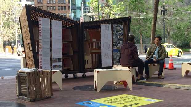 El módulo de arte móvil, un producto de la creación de prototipos movilidad avanzado estudio de arquitectura dirigida por Adam Marcus en el California College of the Arts, propone una arquitectura de estructuras desplegables que pueden configurarse para servir una variedad de funciones. Los módulos dobles se pueden organizar de varias maneras para facilitar el espacio de exposición, espacio para eventos, y espacio de trabajo y aniden para ser seguro en la noche.