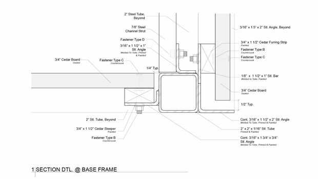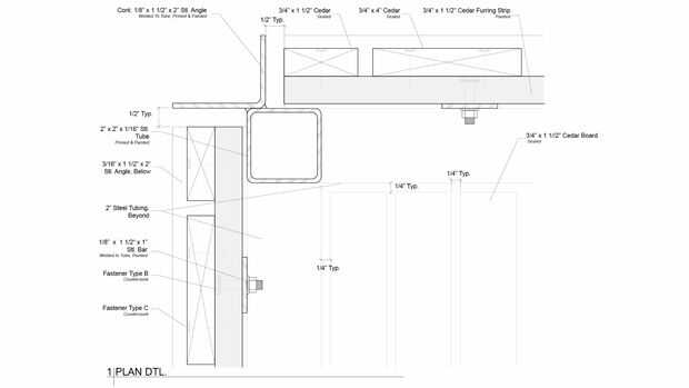 Tableros de cedro fueron seleccionados como el material de revestimiento para su durabilidad y resistencia a la intemperie. El equipo de diseño produjo un número de iteraciones y prototipos a escala real para probar diferentes estrategias para incluir patrones dentro del revestimiento de cedro. El estudio estaba interesado en desarrollar una estrategia gráfica para el módulo que produciría múltiples lecturas en múltiples escalas. El esquema final utiliza patrones de enrutado en las tablas de cedro para producir un texto camuflado "CCA" que se convierte en legibles desde una distancia, pero sigue siendo totalmente abstracta de cerca.