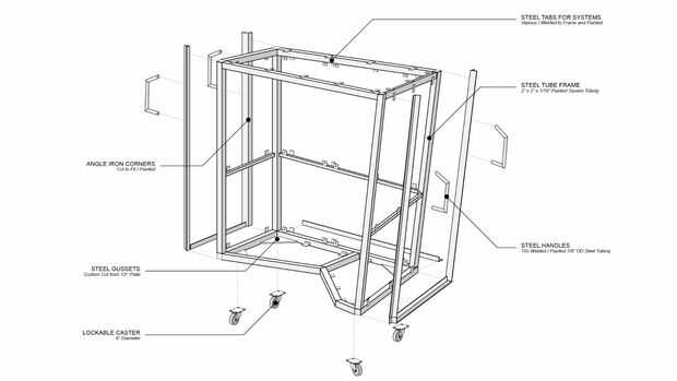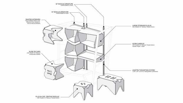 El sistema fue diseñado para proporcionar la máxima flexibilidad y reconfigurabilidad en el tiempo. Los miembros estándar unistrut se montan a la estructura de acero, proporcionando una armadura universal que se puede conectar cualquier cantidad de plugins de montaje en. El equipo de diseño y construcción fabrica una serie de bandejas con tapas desmontables que doble como taburetes, que resultó muy útil durante el festival.