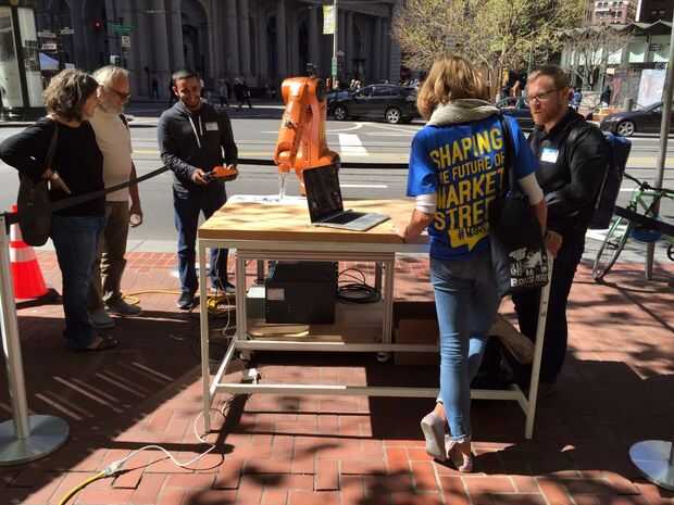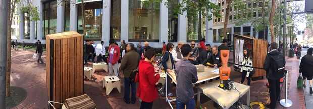 Estudiantes de arquitectura trabajando dentro de un curso impartido por Andrew Kudless en el laboratorio de Arte Digital de CCA demostrará varias técnicas que se han desarrollado en la programación de un pequeño brazo robótico para dibujar y pintar. Los estudiantes han estado explorando la la capacidad creativa de código para producir obras de arte generativo innovador.