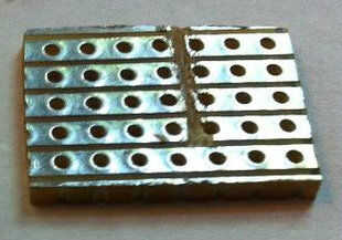 Cortar un trozo de 5 x 7 del protoboard como se muestra usando una Dremel equipada con un disco de corte. Asegúrese de que usted cortar en la orientación correcta. Con un cortador, corte los cuatro primeros rastros como se ilustra. No te olvides que puedes ver el tablero boca abajo al hacer este corte a diferencia de la imagen de diseño en la sección de introducción.