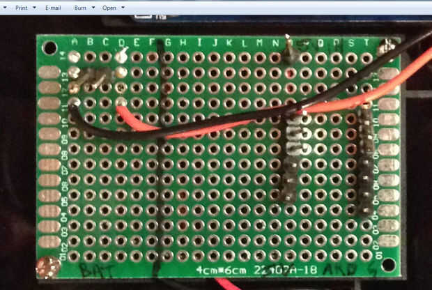 La parte superior izquierda muestra dos pasadores que se enchufe la batería. Los cables rojo y negro que atraviesa la Junta van a un tapón del cañón que suministra el Arduino 9v en su conector de barril donde entonces está regulada a 5v para el control del procesador.