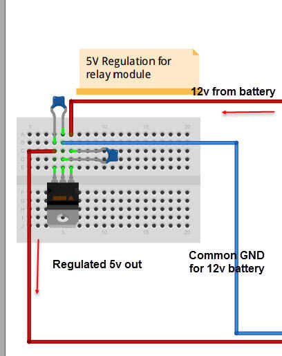La placa de relé que estamos utilizando necesita 5v para disparar el relé. Tenía habitación en este foro "detección nodo mudo" y no quiere perder otro protoboard así que apreté este circuito allí. Lo mismo que la anterior fuente de 5v construida, condensadores y todo.
