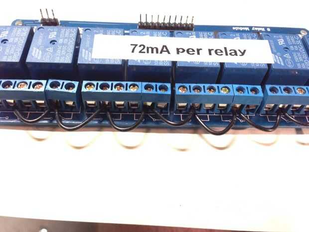 Como se describió anteriormente, se conectará los cables rojos de cada relé para el puesto de enlace correspondiente (uno negro). Para suministrar voltaje al circuito me desnudaron el aislante de un trozo de alambre de cobre y conectados todos en paralelo. Este cable se conecta entonces con el terminal V + de la batería de plomo 12v.