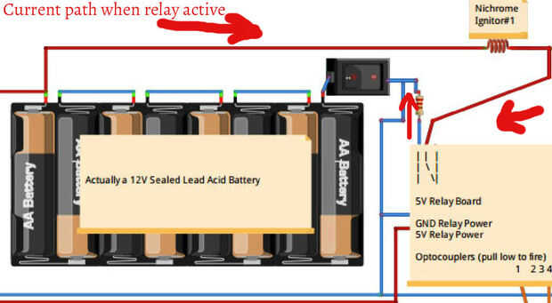 Conecte todos los terminales de centro del relé en paralelo como se muestra en las fotos de la placa de relé. Luego ejecute este cable a su 3 ohm, resistor de 50 vatios. De esta manera cuando el relé se activa la resistencia agrega resistencia significativa más allá de la resistencia del alambre del nicrom. Se convierte de una carga de ohmios 1/2 para una carga de 3,5 ohmios. Esto reduce considerablemente la corriente suministrada por la batería de plomo que debe prolongar su vida y prolongar la vida útil de cada encendedor de nicrom. Pasamos de dejar caer 12 voltios a través de nicrom a poco menos de 3 voltios. Esto resulta en una caída corriente de 20 amperios a poco menos de 2 amperios.