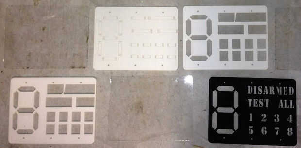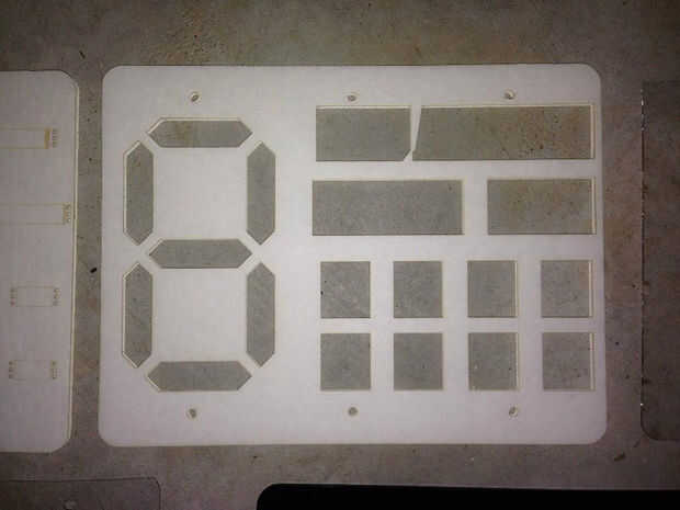 Decidió emular una pantalla de 7 segmentos para el temporizador regresivo y fui con palabras fijas para los diferentes modos y fijo los números para los distintos nodos. Decidí cortar el enmascaramiento frontal de la pantalla de 1/8" negro acrílico del molde para que coincida con el panel de control y el caso. Todo lo había redactado en Inkscape y lo tomó a mi FabLab local para cortar en su Epilog Mini 40W.