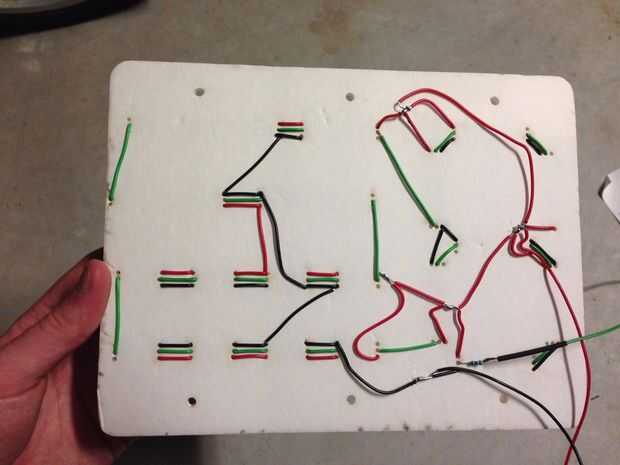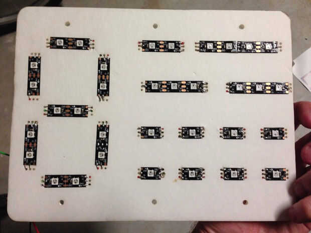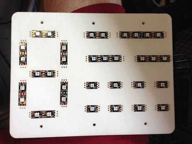 Después de cortar sus LED tiras en longitudes apropiadas y pegándolas en el tablero de la espuma en el laser grabado al agua fuerte áreas debe soldarlos todos juntos. Para mantener buena luz de bloqueo entre los segmentos corrí todos los cables en la parte posterior, penetra por los agujeros y soldadas en las almohadillas. Es un montón de corte y doblez de alambre pero no te preocupes, después te acostumbras a él solamente lleva 2 + horas. V + nodos sólo necesitan a todos conectarse en paralelo. Utilicé cable rojo para mantener las cosas organizadas. Nodos GND también deben cablearse en paralelo, para esto utilicé alambre negro. Nodos de datos son diferentes y más tedioso. Los datos sólo fluyen en una dirección y los LEDs que están en secuencia por qué orden conectáramos en saben. El primer LED viendo los datos desde Arduino es el número 0 y 1, 2, 3 y así sucesivamente. Conectar todos los LEDs en serie 34 (LEDs #0 aunque #33). Usé alambre verde para representar datos.