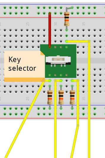 Será fuente de 5v al pin itinerante de la llave y luego tener cables saliendo de las cuatro posiciones diferentes que se van a los pines de entrada-salida de Arduino. También le cable una pull-down resistor en cada uno a tierra para evitar que ninguna lectura flotante. El diagrama de Fritzing es no mostrar lo mejor (que no tienen un selector de llave en su biblioteca de piezas) pero si tienes uno de estos en la mano es muy fácil de entender mediante el sondeo alrededor con un multímetro.