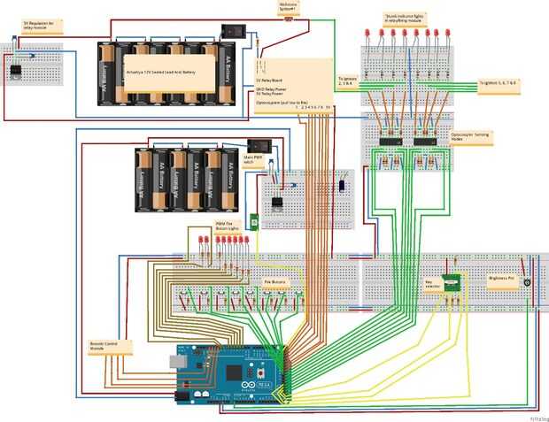 Arduino - decidí ir con un Arduino Mega 2560 debido a todas las E/s hermosa. Necesitaba mucho para este proyecto si quería alejarse de registros de entrada y salida de cambio porque no sé mucho acerca de ellos. Si tuviera que hacer este proyecto otra vez yo podría fácilmente ponerse al día en los registros de cambio que simplifique el cableado y me permite hacer algo más práctico como un Arduino Uno. El bosquejo requerido solamente por debajo de 8 k para que el Mega es "Mega" overkill. Asimismo, si desea construir algo con menos nodos de leña, usted podría probablemente bajar el número de i/os necesitada manteniendo un diseño similar. Si desea más nodos de la leña podría utilizar registros de desplazamiento y más relés de acodar el número hasta cerca de infinito.