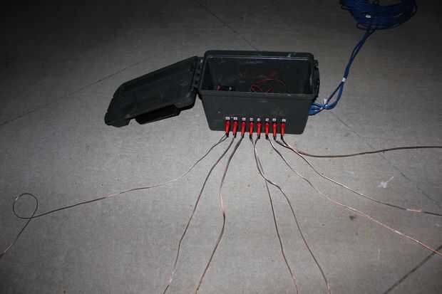 Fui con cable para la conexión entre los terminales de conexión y el encendedor y hacían cada 10 pies largo para darles cierta distancia entre fuegos artificiales, si así lo desean. Atado al extremo del alambre en un extremo es que encajan en los terminales de conexión de enchufes de plátano. La polaridad no importa en lo más mínimo.