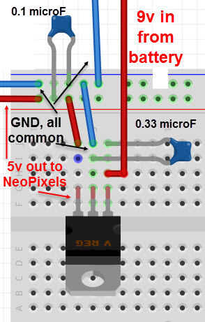 La pantalla que he diseñado para esto corre de NeoPixels (WS2812B LED). Es una manera fácil de crear una simple pantalla de encargo y he utilizado en muchos otros proyectos. Son muy felices ejecutar fuera de 5v y eso es exactamente lo que haremos aquí. Son, sin embargo, la energía demasiado hambrientos para ser accionado por el regulador integrado de Arduino, así que tenemos que construir un circuito de regulación de voltaje independiente a ejecutar en paralelo.