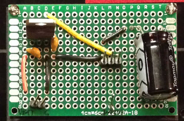 Hay un gran condensador electrolítico en la junta entre 5v y GND para suavizar la potencia va a la NeoPixels. Adafruit recomienda un 1000 micro faradio cap aquí, pero dado sólo tienen una pequeña cantidad de píxeles aquí fui con algo mucho más pequeño ya que tengo muchos otros proyectos. Creo que este es un cap de 47 micro faradio y me ha funcionado muy bien.