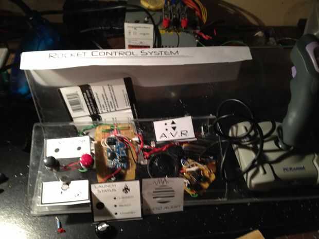 Alambré el botón disparador y el pulgar para operar el "sistema" Resonador de Vector aceleración, que es un circuito que reciclé de un proyecto mayor utiliza el picaxe sentido uno de los dos botones empuja y parpadea un led y emita un tono ascendente o descendente según el botón que se pulsa. Si pulsa un botón demasiado hay un ruido de explosión.