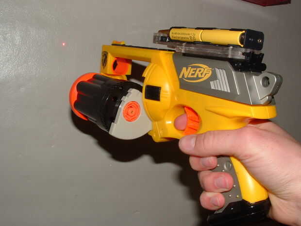 Un método mucho más simple sería perforar un agujero en la parte delantera de la pistola y hacer un mecanismo láser interna inicialmente previsto (tutoriales ya existen para esto), pero también adjuntar un DC de puerto para cargar las baterías con un 7.5v red adaptador.