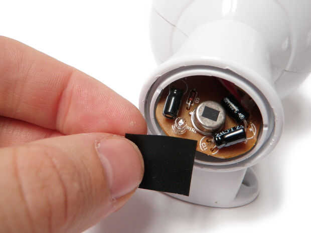 El sensor de luz es lo que permite saber que es de noche y deben activar el sensor de movimiento. Queremos que la luz de la noche a pensar siempre que es noche. Para ello, necesitamos para cubrir el sensor de luz con cinta aislante.
