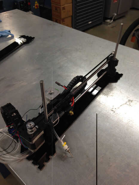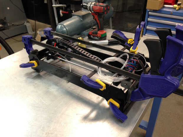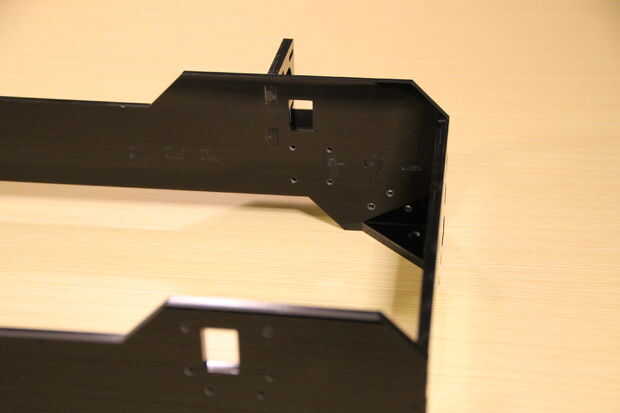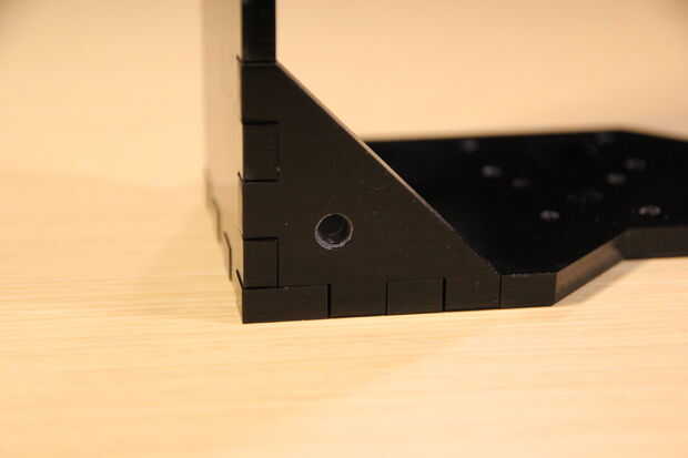 Montar el cuadro siguiendo las imágenes arriba, tejer las juntas de los paneles de cuatro marco juntas y refuerzo de las esquinas con triángulos pequeños. El Pórtico montado se puede utilizar en este momento para ayudar a alinear las piezas de acrílico, pero Plaza de maquinista debe utilizarse para comprobar todas las esquinas antes de la adhesión. Una vez que todo esté en su lugar, aplicar cemento acrílico en las uniones del marco desde el interior, asegurándose de que absorbe en todas las superficies de las articulaciones. Me gusta usar un aplicador de aguja para este paso. Tenga en cuenta que el pórtico se puede instalar en este paso al combinarlo con el siguiente paso.