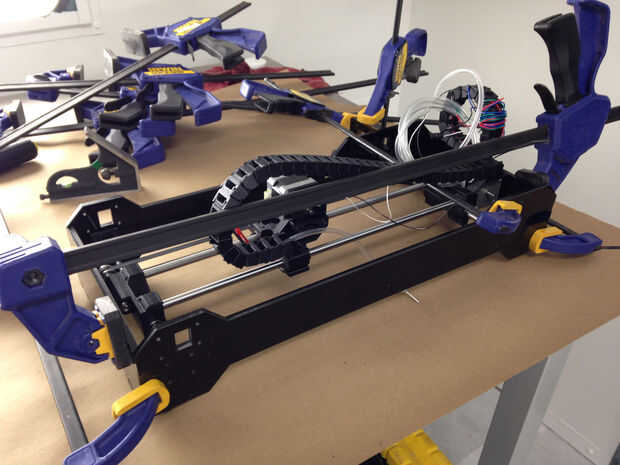 Láser corte todas las piezas contenidas en gantry_DXFs.zip. Mientras que las piezas del marco todavía tienen su capa de papel protector, toque todos los agujeros pequeños mediante el grifo M3 y los agujeros más grandes en las fichas de refuerzo de esquina, toque con el M6 Tab. sujeción de los grifos en un taladro de mano acelera el proceso.