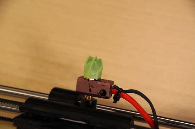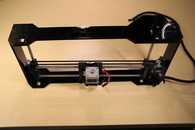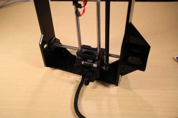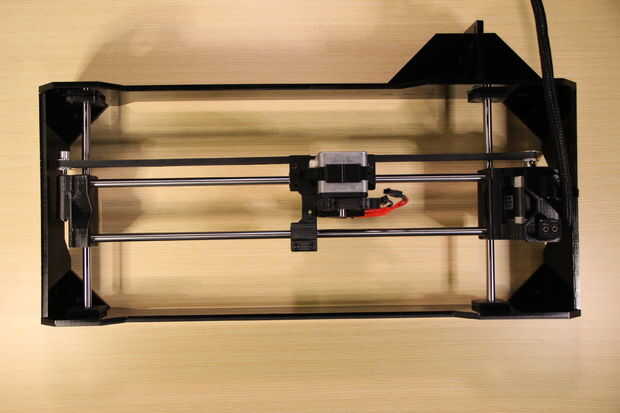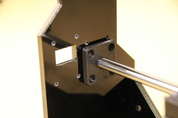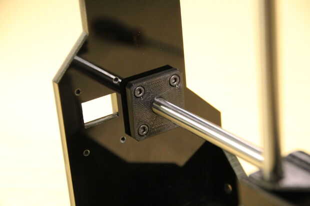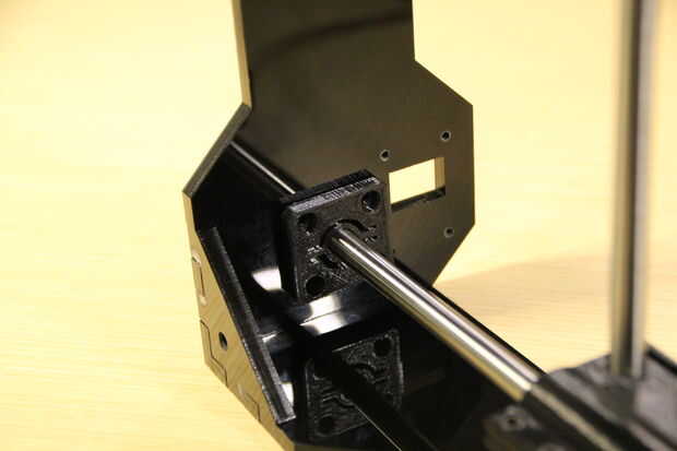 Cubierta de la boquilla de la extrusora con varias capas de cinta o retire el hotend del carro para evitar daños durante el montaje. Coloque el marco de modo que está de pie en la parte frontal y luego deslice con cuidado en el pórtico. Utilice los tornillos M3x8mm para fijar los soportes de eje a la parte posterior del marco (el parte de pie en el aire). Con los asegurados, gire suavemente el marco en uno de sus lados más cortos y fije los dos soportes de eje a la cara frontal del marco. Asegúrese de que las monturas compatibles están orientadas para que los vacíos de aire son en el plano con el pórtico. Estos soportes de eje restringen el eje en las direcciones Z y Y, pero permiten una pequeña cantidad de cumplimiento en la dirección X para evitar el atascamiento.
