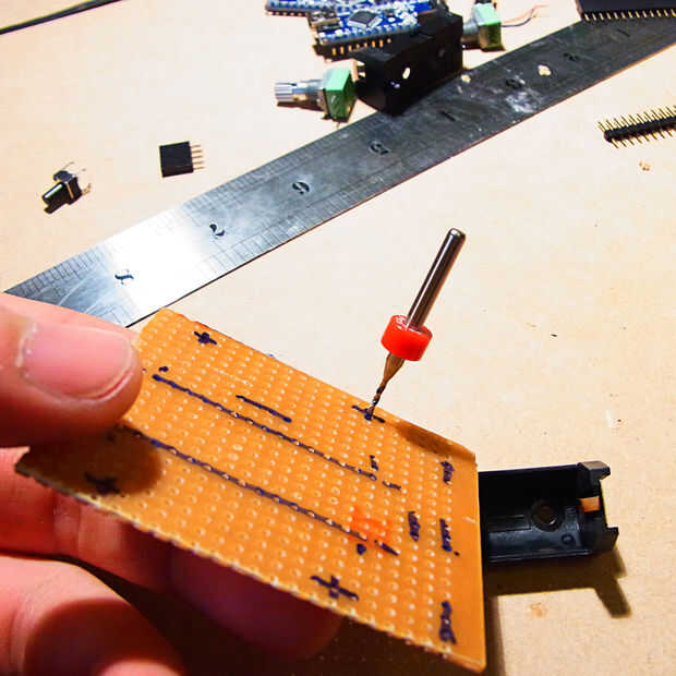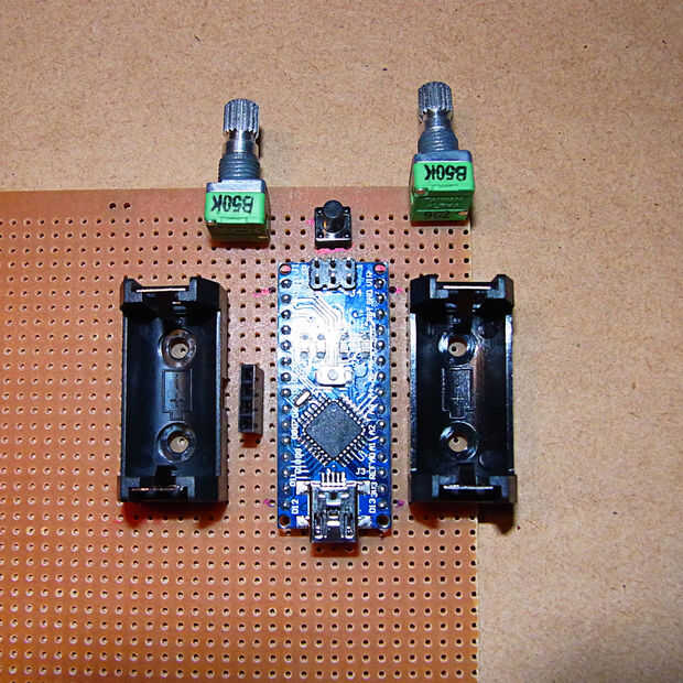 2. Interruptor de diseño 2 x 9mm ollas, 1 x arduino nano, tacto de 1 x, 1 x 1 x encabezado de 4, 2 x soporte de batería en el lado no cobre de la Junta de tira.