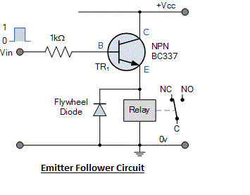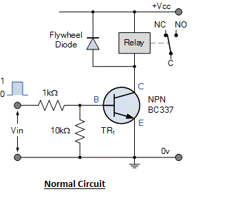 Aquí había utilizado circuito de seguidor de emisor NPN transistor para accionar relés (cheque bondadoso de este). En realidad mediante el uso de este circuito, Arduino no es necesaria para proporcionar voltaje a las bobinas de relé (reciben corriente de una fuente de alimentación diferente), pines digitales sólo dan voltios pequeña señal al pin de la base del transistor que completa el circuito por el que puede controlarse el relé.
