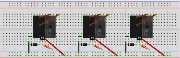 Seguir el circuito determinado y recomiendo a construir primero en un protoboard. Compruebe el circuito si funciona correctamente, si no, tal vez el transistor npn no soporta circuito de seguidor de emisor. Intente configurarlo como un normal 'npn transistor como un interruptor de circuito', que funciona muy bien. Asegúrese también de que diodo volante está conectado a través de bobinas de relé de manera correcta. Una vez que está funcionando bien, soldadura permanentemente en un perfboard o pcb. Puede conectar tres zócalos terminal de tornillo para relés NO, COM del relé ' y la entrada base del transistor a través de resistencia ' para facilitar la. También un conector terminal de dos tornillos para ''(for relay) de la fuente. Que no había usado tres zócalos terminal de tornillo porque tengo que poner este módulo relé en mi proyecto en el que no es necesario destornillarlos alguna vez en el futuro, por lo que será una pérdida total de la utilización de estos, había soldado les via cable en mi circuito de conducción principal. También puede Agregar LEDs para indicar el estado del relé.