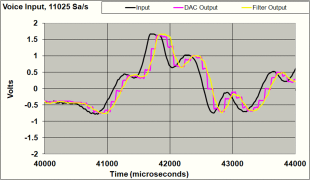 El gráfico aquí (igual que en Step 7) muestra la entrada de señal de salida DAC y salida del filtro de reconstrucción. Para frecuencias de menos de la mitad la frecuencia de muestreo, el circuito se realiza bien en reconstruir la señal original.