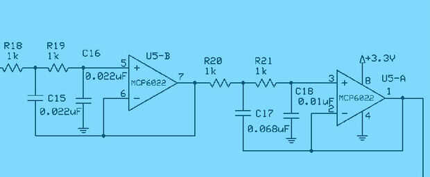 El filtro usado aquí se compone de dos segundo orden que salen-llave filtros en cascada. Amp OP B U5 U5-a son los amplificadores op, configurados para una frecuencia de corte total de aproximadamente 6 kHz. R18, R19, C15 y C16 establecen la frecuencia de corte de la primera sección de filtro y R20, R21, C17 y C18 la frecuencia de corte de la segunda sección de filtro.