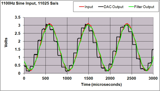 Los gráficos muestran cómo comparan la señal de entrada, salida DAC y filtradas salidas (reconstruidos). La primera gráfica muestra la respuesta cuando la entrada es una onda senoidal, y el segundo gráfico muestra la respuesta de una señal de voz. Tenga en cuenta la forma de la escalera de la salida DAQ, y que en gran parte se elimina por el filtro de reconstrucción.