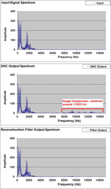 También he incluyo un gráfico que muestra la frecuencia de las representaciones de dominio del caso donde la entrada es una señal de voz. Observe que la salida DAC sin filtrar contiene imágenes de la señal de voz de banda base alrededor de la frecuencia de muestreo (en este caso, 11025 Hz). También tenga en cuenta que el espectro de la señal de salida del filtro de reconstrucción estos espectros de imágenes filtrados y asemeja el espectro de la señal de entrada.
